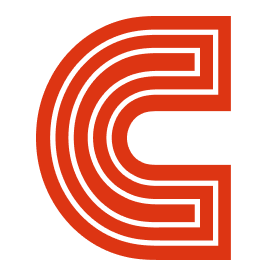 A large gray letter 'C' with a scene of a person sitting on a stage, illuminated by colorful lights, visible within the letter.